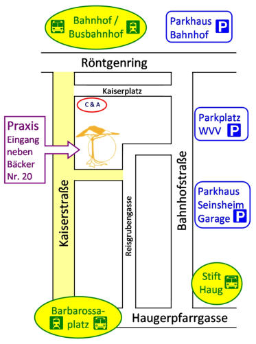 Die Praxis ist in der Kaiserstraße 20 in der Innenstadt, nur 5 Minuten Fußweg vom Bahnhof entfernt. Parkmöglichkeiten sind in Laufweite. Der Eingang liegt zwischen einem Bäcker und einem Schnellimbiss.