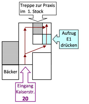 Die Praxis befindet sich im 1. Stock und ist sowohl mit Aufzug, als auch über das Treppenhaus an der Rückseite des Gebäudes gut zu erreichen.